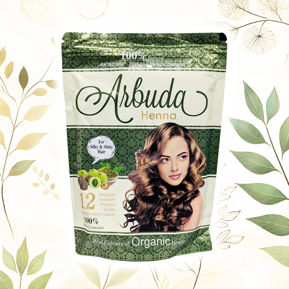 Indulge in the luxury of Arbuda Organic Henna. Handpicked from the finest Rajasthani leaves, blended with 12 herbs from the Himalayas for premium quality. Nourish and condition your hair, leaving it silky and soft. Elevate your haircare routine with this exclusive herbal henna.