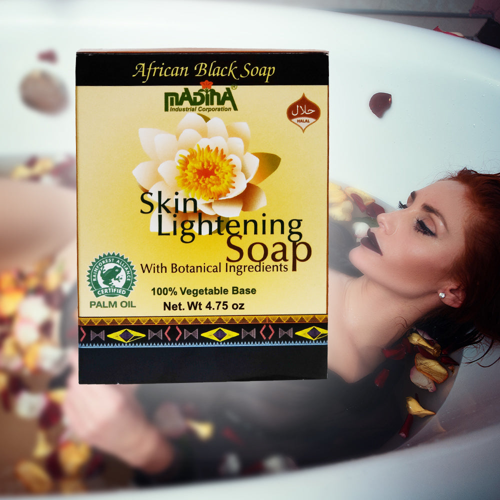 Skin Lightening Soap contains a blend of Natural Cooca Butter, Aloe Vera, and Botanical Properties to clean your skin and help control essential moisture. Restores moisture to dry, tight skin. Madina's ancient African formula has been fortified with natural herbal essential ingredients.
